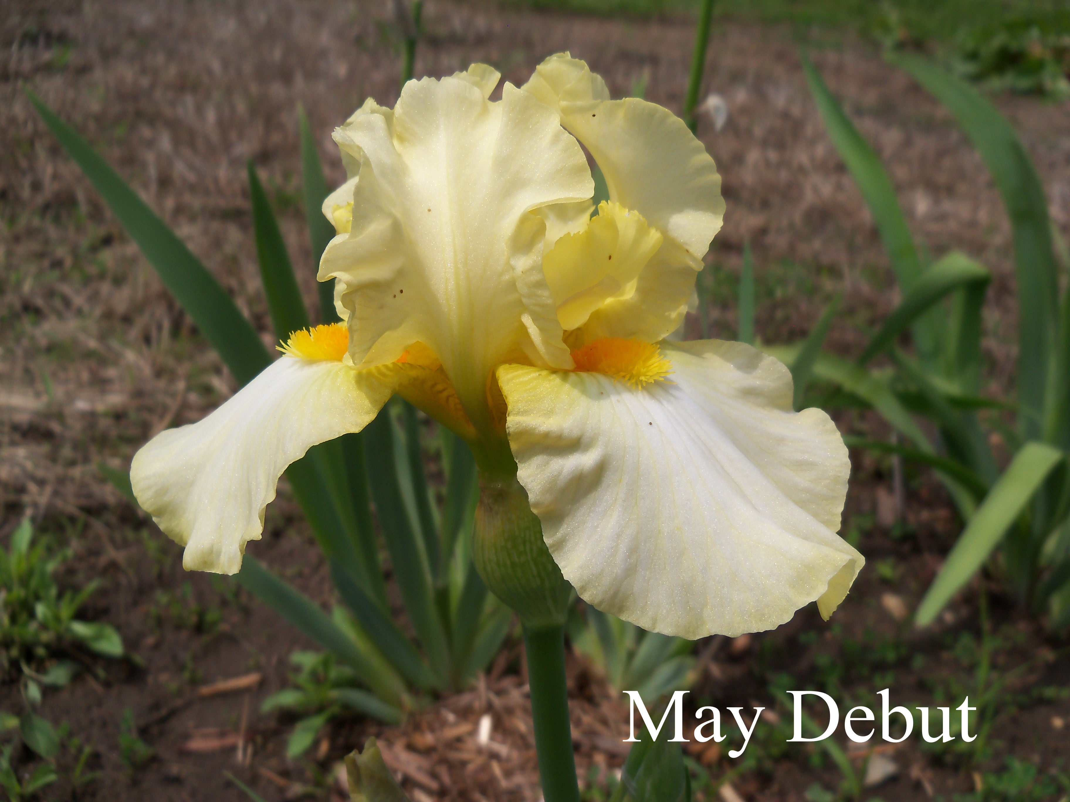 Since then I’ve learned more about ‘Wabash’ from the Iris Encyclopedia. It was the American Dykes Medal Winner in 1940. There also can be confusion between it and ‘Bright Hour’, a hybrid from ‘Extravaganza’ and ‘Wabash’. The real ‘Wabash’ has purple based foliage, while ‘Bright Hour’ does not, a distinction I was not aware of when looking at the iris. From the purple near the bloom in this picture, I suspect this is the real ‘Wabash’. In any case, you can be sure I will be looking closely at the foliage as well this year!