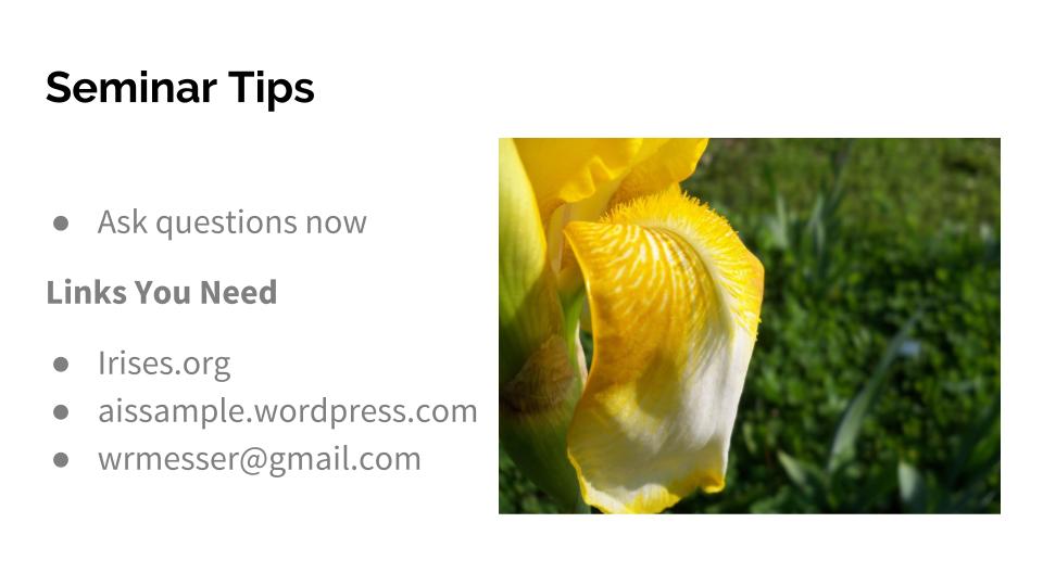 A number of Region 21 members speak about irises to various garden interest groups. BJ Jackson spoke earlier this year at the Manitoba Horticultural Association Annual Meeting. Kris Jurik has been speaking to various Iowa Master Gardener groups. And Wayne Messer presented at the Cass County (Iowa) Master Gardener Spring Seminar. Both Gary White and Kelly Norris speak to a variety of gardening groups.